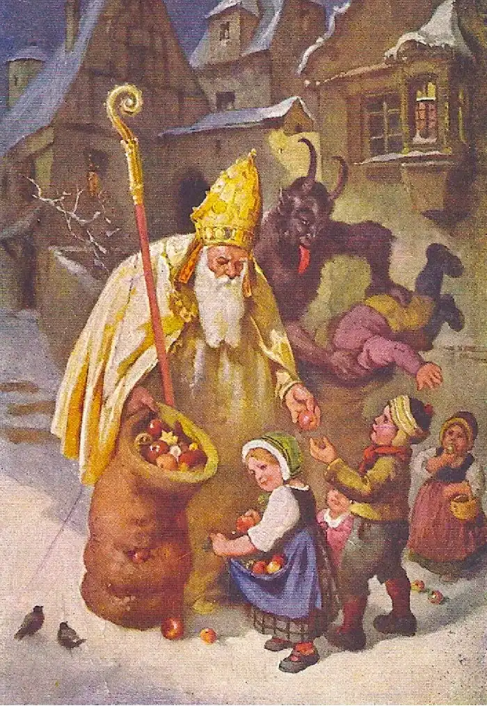 Обратите внимание: не зря Мартин Лютер не ждал добра от этих народных культов святых! Полюбуйтесь: за спиной у Николая в епископском облачении – нечисть Крампус, получёрт-полукозёл, запихивающий в мешок непослушных детишек! Ай-яй-яй. Хотя детишкам, конечно, весело.