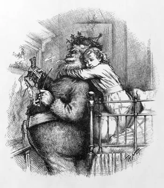 Клемент Мур пишет целую поэму, в которой изображает (словесно изображает) Санта-Клауса: он румяный, пузатенький, весёлый, в меховой шубе, передвигается на оленях по небу (приводятся имена оленей), покуривает трубочку... Поэма постепенно становится популярной в Америке, и вот наконец 1881 году политический карикатурист Томас Наст рисует Санта-Клауса по лекалам Мура (только меховую шубу заменяет на нелепую коротенькую курточку):