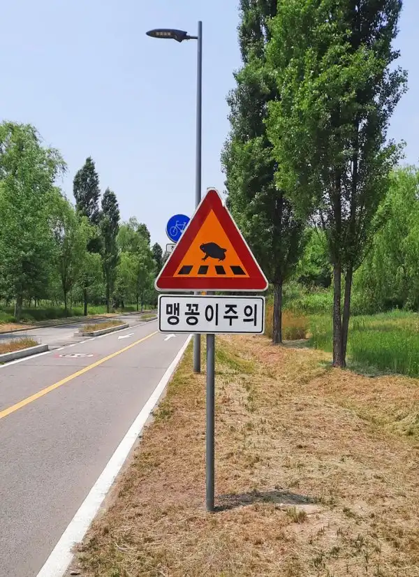 Кое-где встречаются знаки, которые предупреждают водителей, что дорогу могут пересекать лягушки
