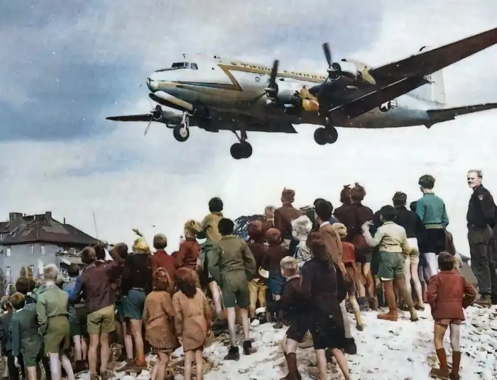 Жители Западного Берлина наблюдают за посадкой самолета Douglas C-54 Skymaster в аэропорту Темпельхоф, 1948 год