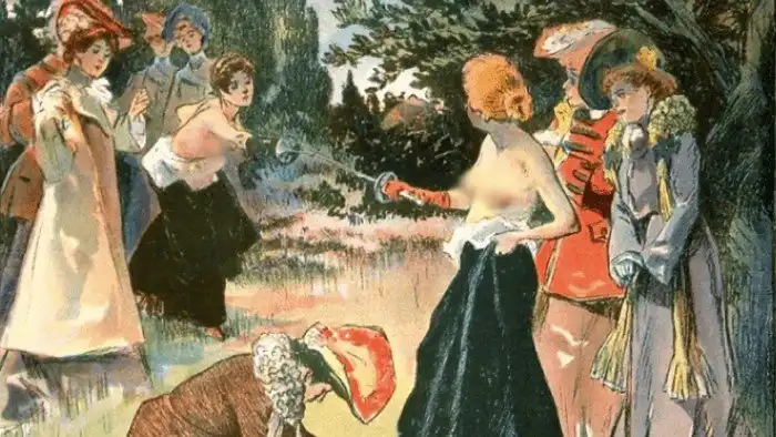 Во Франции, действительно, дрались несколько иначе. Платья стесняли движения. Кроме того, считалось, что при ранении шпагой, в плоть могли попасть частички одежды, а рана загноиться. Во избежание проблем француженки сражались либо топлес, либо полностью обнаженными.
