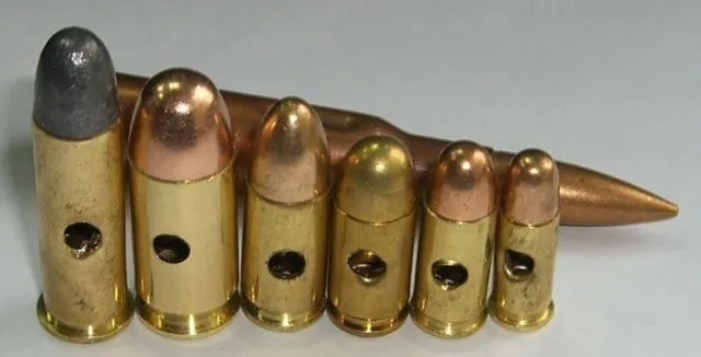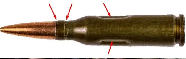 Итак, чем эти патроны приметны. Если вы приглядитесь к патронам на фотографии выше, то заметите на их гильзах продольные вмятины (правильнее - выштамповки). Кроме того, продемонстрированные патроны отличаются наличием двух кольцевых обжимок пули в районе дульца гильзы: