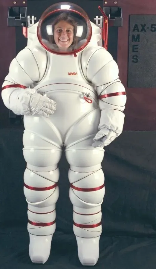Это AX-5, который планировали использовать на МКС. Костюм имел алюминиевую основу, покрытую эмалью. Странные гигантские суставы имели сложную конструкцию. Однако они позволяли астронавтам свободно двигаться, почти как человеку без скафандра.