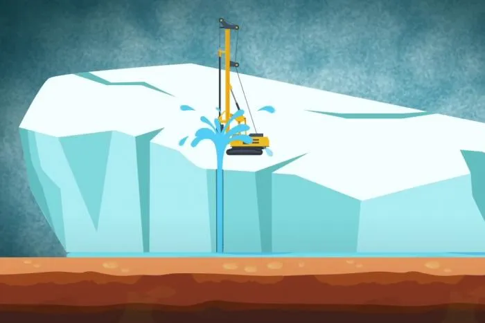 Геоинженерные решения могут быть применены не только к верхней, но и к нижней части ледников. Многие из них движутся и, совсем как реки, впадают в океан. Чаще всего это происходит из-за наличия под ними водяной прослойки, способствующей скольжению. Последняя может возникать вследствие нагрева льда более теплой сушей или как результат трения. Также влага проникает вниз сквозь трещины и разломы. В любом случае, устранение воды должно замедлять движение ледника в сторону океана.
