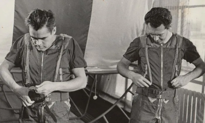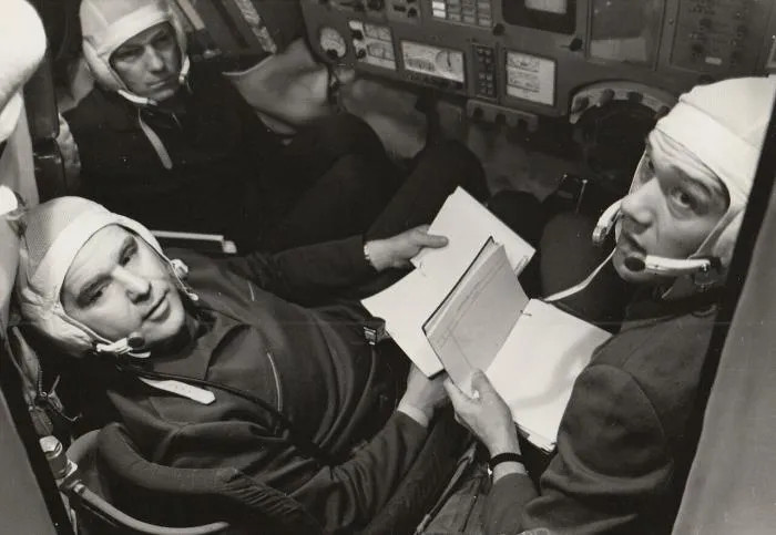 Тот же самый год и тот же самый экипаж, но здесь он запечатлён во время тренировок. Учитывая, какие нагрузки испытывает человек при отправке за пределы планеты, то надо думать, что со здоровьем у этих мужиков всё было в полном порядке. Тем более тогда вся эта тема только изучалась, и вряд ли кому-то в голову могло прийти, что полёты в космос станут чем-то рутинным и будничным.
