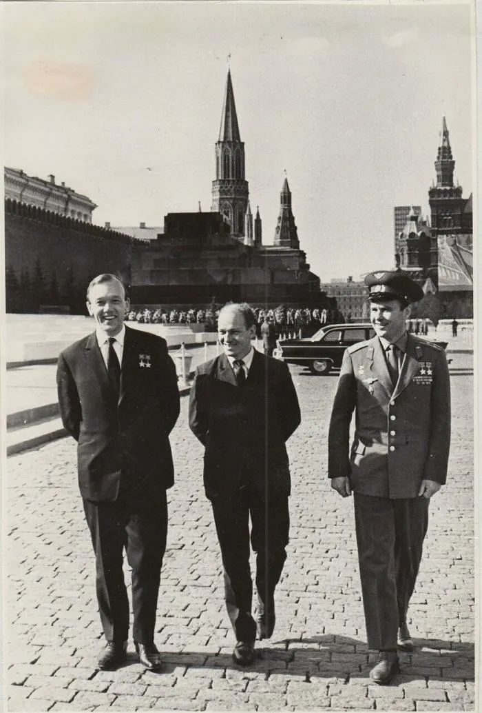 К заглавному фото мы вернёмся чуть позже, а пока что откатимся в 1970 год. Перед нами экипаж корабля «Союз-9». Андриян Григорьевич Николаев и Виталий Иванович Севастьянов прогуливаются в Кремле. Их полёт длился 17 суток и проходил летом 1970 года. В Кремле же они оказались, по всей видимости, после успешного приземления. И тут есть огромная разница между посещением Кремля в туристических целях и по приглашению.