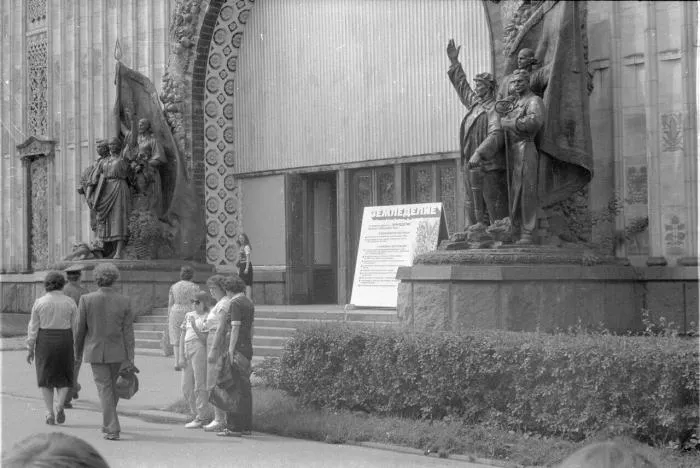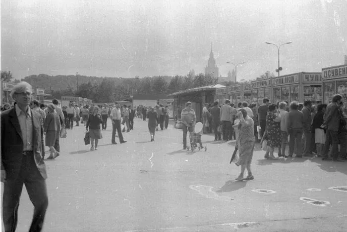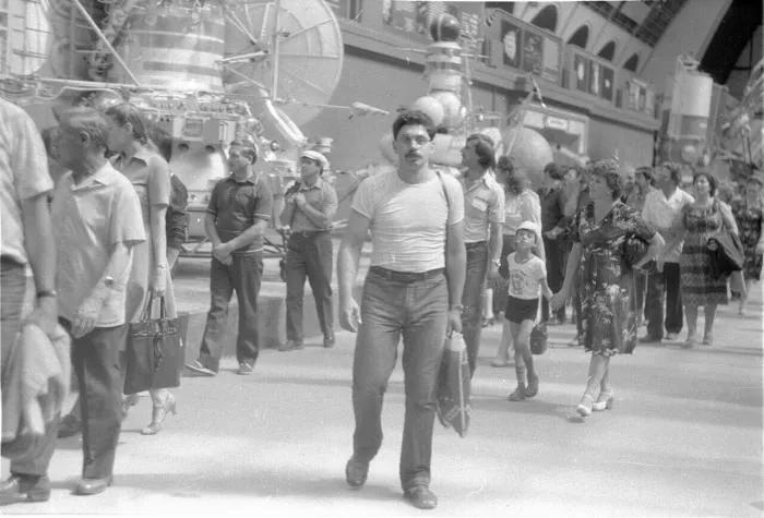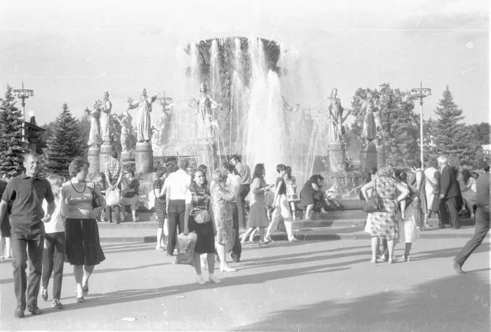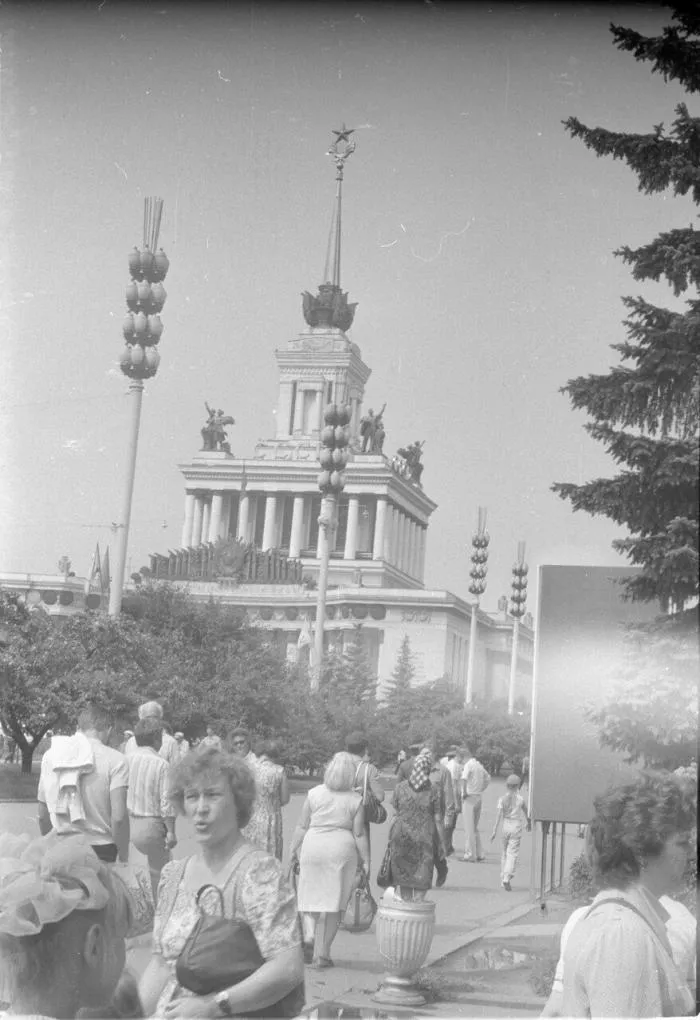Почти по центру следующего кадра можно разглядеть молодую девушку и, по всей видимости, она со своим молодым человеком и наведывалась тогда в столицу огромной империи. Думаю рассказывать о том, где именно сделан этот кадр, нет никакого смысла. Если музей космонавтики со стелой около него кому-то и неизвестен, то уж шпиль Останкинской башни точно все знают. А фото видимо, сделано около входа в метрополитен на станции ВДНХ. Одна из самых загруженных станций метро к слову. Туристы туда любят ездить, как видите со времён Советского Союза и оно логично.