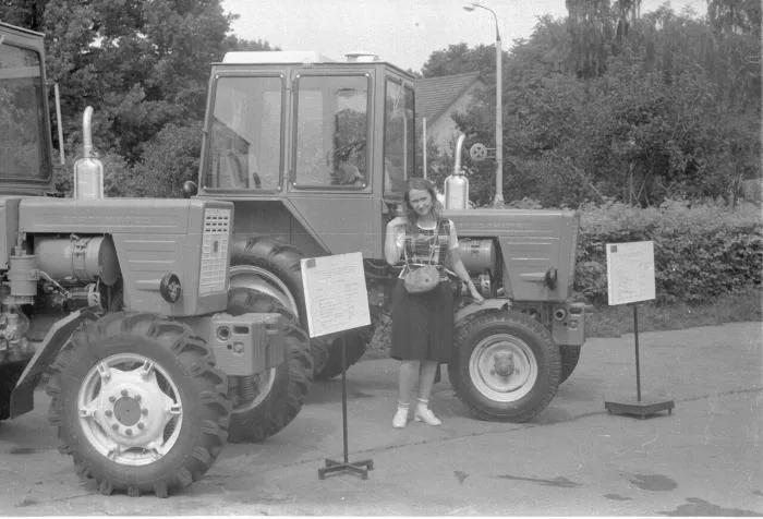 Предположу, что девушка и её молодой человек были как-то связаны с сельским хозяйством. Во всяком случае, не часто можно увидеть, как кто-то фотографируется с трактором. Ну и нельзя не отметить, что когда-то наша промышленность могла делать вообще всё самостоятельно. Ну ладно, почти всё.