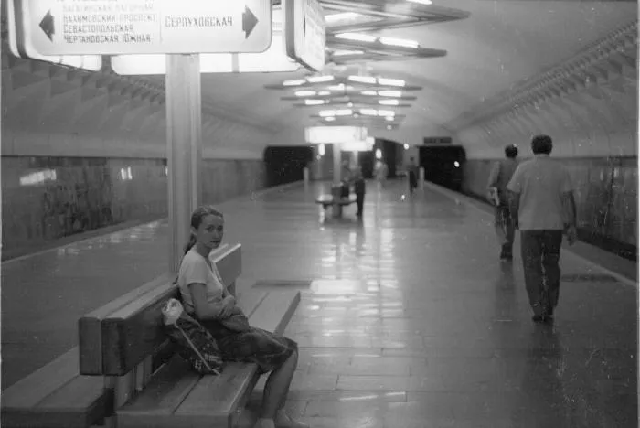 Жили же наши туристы, судя по всему где-то в районе Нагорного проспекта. Как раз от станции метро «Тульская» туда и удобно добираться на автобусе. Это сейчас у нас куча приложений в телефоне, а тогда сел на автобус и вперед. Кадр как раз остановки общественного транспорта.
