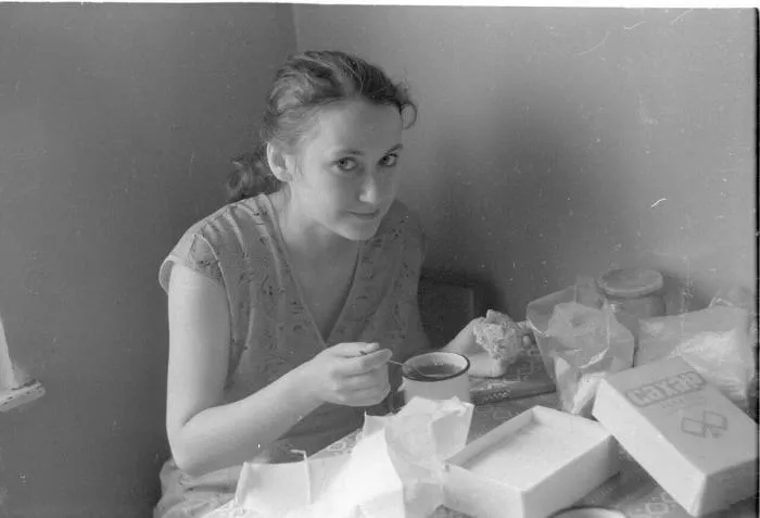 На этом милом кадре можно было бы, и завершить подборку. Тем более Москва по сути уже закончилась, однако детали того времени интересно рассматривать. Вон, видите, лежит на столе пачка рафинада. Опять же и чай девушка пьёт из эмалированной кружки. Сейчас такое не встретишь.