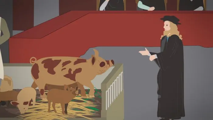 На протяжении столетий в Европе в таких странах, как Швейцария, Франция, Италия, практиковались суды над животными за преступления, совершённые ими против Бога, людей и чьей-то собственности. Ответчиками могли были, например, свиньи. Или крысы, кузнечики и даже улитки. Эти судебные процессы проводились в двух вариантах: светские, когда подавался иск против животного или группы животных, которые на кого-то напали, или церковные, когда подавались иски против вредителей, таких как саранча или крысы, которые были отлучены церковью за кражу зерна. Вот хороший пример суда над животными из 15-го века: в парижском пригороде Савиньи, в декабре 1457 года, свиноматка с шестью поросятами, обезумев, напала и убила пятилетнего мальчика. Семь свиней были пойманы с поличным при совершении жестокого преступления, ловко схвачены, брошены в загон и преданы суду. Свиноматку приговорили к смертной казни. Поросята были залиты кровью, но их всех оправдали, поскольку невозможно было доказать, что они причастны к нападению.