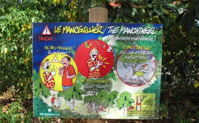 Но вернёмся к двуногим. Чтобы не быть совершенно поверженными, люди ответили деревьям мелкой подлостью. Растения начали повязывать красной лентой и ставить рядом таблички, предупреждающие о смертельной опасности. Картинки яркие, красивые, с черепом и костями, или же с корчащимся туристом, как раз чтобы привлекать внимание последних, и чтобы глупые иноземцы даже близко у манцинеллы не околачивались. «Ну и не больно-то и хотелось,» – обиженно думали деревья, сочась ядом и злобой.