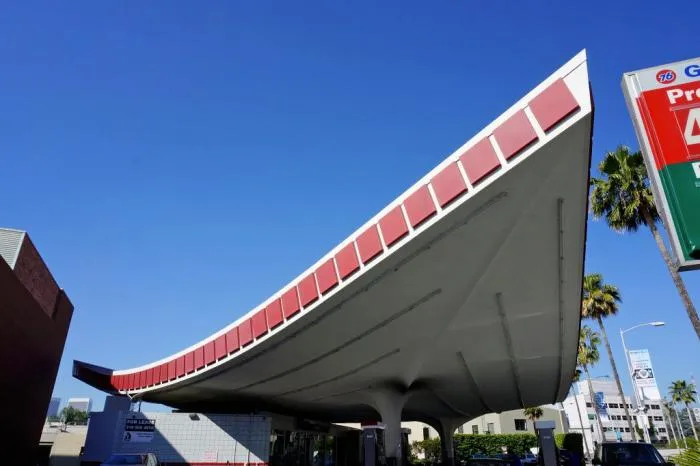 В начале 1960-х годов архитектор Джин Д. Вонг проектировал эту АЗС в Беверли-Хиллз, полагая, что она будет соседствовать с международным аэропортом Лос-Анджелеса. Идея полета вдохновила Вонга на создание изогнутой крыши, которая кажется взмывающей в небо с трёх опорных точек.