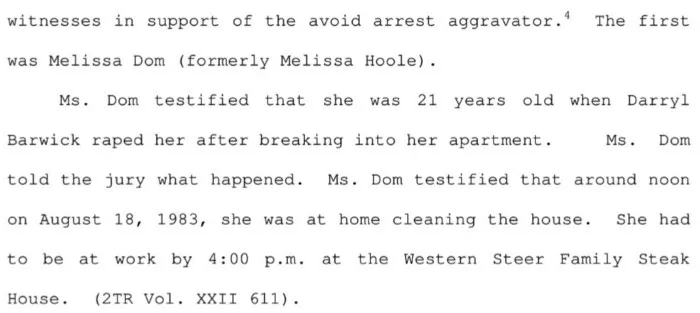 Не ясно, был ли осуждён Барвик по тому обвинению за 1980 год, но к августу 1983 на тот момент 16-летний Барвик был на свободе. 18 же августа, Барвик, находясь в тот момент в городе Панама, Флорида, решил что "хочет изнасиловать какую-нибудь случайную женщину", поэтому он вооружился ножом, взял с собой лыжную маску и стал ходить по городу в поисках жертвы. Такой стала Мелисса Дом, 21 год, которую Барвик заметил у её квартиры в комплексе апартаментов, когда та развешивала свою одежду.