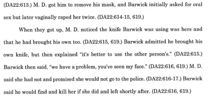 Барвик дождался когда Мелисса войдёт обратно в свою квартиру, одел маску на лицо, достал нож, пробрался в квартиру и приставил нож к горлу Мелиссы, а затем потащил её в спальню. Там Барвик дважды изнасиловал жертву, в процессе сняв маску, и затем сказал ей что если она сообщит в полицию о произошедшем, то он её найдёт и убьёт - в ответ Мелисса пообещала Барвику что не будет обращаться в полицию и тот ушёл из её квартиры, не нанеся ей каких-либо ножевых ранений: