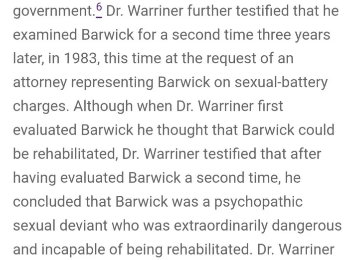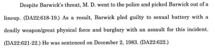 В неназванную дату 1980 года, но точно до сентября, на тот момент 13-летнему Барвику предъявили обвинения в штате Флорида по неназванному преступлению - судя по всему, речь шла о домогательствах к одной женщине и нанесении побоев другой. В ходе суда, адвокат Барвика вызвал в качестве свидетеля-эксперта психолога Клелла Уорринера, который в свою очередь представил перед судом выводы из психологического осмотра Барвика, гласившие что тот был сексуальным извращенцем-психопатом, страдавший импульсивным расстройством и демонстрирующий влечение к неконтролируемым половым актам, однако одновременно с этим согласно оценке Уорринера - Барвик способен к реабилитации и не совершит в будущем преступлений в случае правильного лечения: