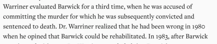 До проведения суда за это преступление, адвокат Барвика связался с тем самым психологом Уорринером, который обследовал Барвика в 1980 году, и попросил его снова обследовать Барвика чтобы представить результаты для суда. Уорринер действительно обследовал Барвика, дав то же психологическое описание что и в 1980 году, но на этот раз Уорринер пришёл к выводу что Барвик уже не способен к реабилитации: