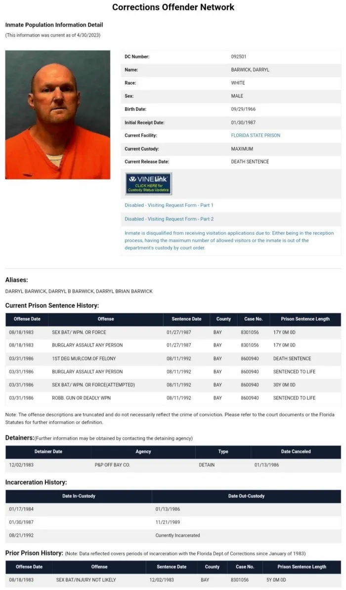 Последние обычные апелляции Барвика были отклонены в 2018 году, но дата казни не устанавливалась губернатором штата Рональдом ДеСантисом (во Флориде дату казни устанавливает именно губернатор, а не какой-либо суд или прокуратура) до 2020 года из-за нехватки смертельных инъекций для казни и уделения внимания тем смертникам, что были серийными убийцами (Боби Джо Лонг и Гэри Рэй Боулз), а с 2020 по 2022 из-за ковида. Лишь к 2023 году, штат наконец смог получить достаточно много смертельных инъекций после того как был принят закон о засекречивании личности поставщиков инъекций и в апреле губернатор установил дату казни для Барвика на май.