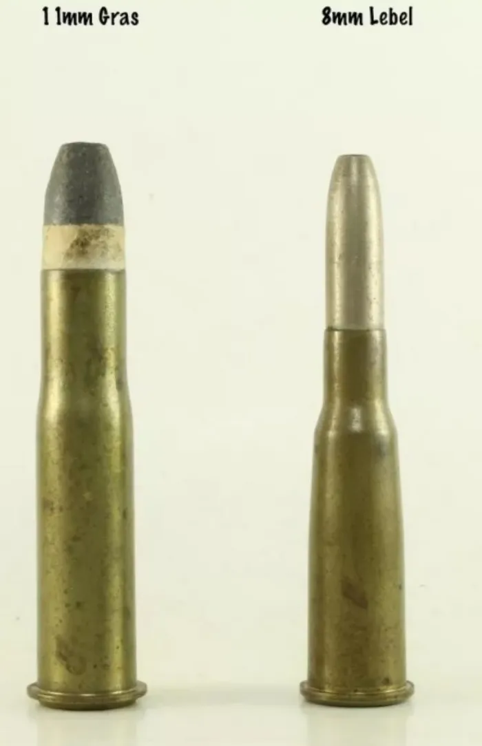 Проблема в том, что сначала надо подобрать нужный уменьшенный калибр. Кроме того, возросшая скорость просто срывает свинцовую пулю с нарезов, поэтому её нужно упаковать в ту самую цельнометаллическую оболочку. Пока французы решали эти проблемы, сроки уже подошли к концу, поэтому, получившуюся пулю тупо впихнули в 11 мм гильзу Гра. А получившийся патрон 8×50R тупо впихнули в переделанную винтовку 1885 года. Так и получилась винтовка Лебеля 1886 года.