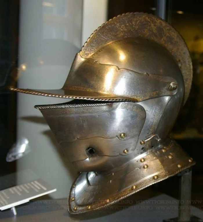 Шлем, принадлежавший Анну I де Монморанси, маршалу, а затем коннетаблю Франции. В битве при Сен-Дени (1567 г.), в возрасте 74 лет, он был ранен в лицо, но несмотря на это, продолжил сражаться. После этого, он получил пулю в спину, рана оказалась смертельной и, спустя двое суток, Анн умер.
