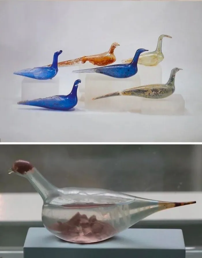 Римские стеклянные сосуды в форме птиц, использовавшиеся в качестве флаконов для духов. Чтобы открыть такой сосуд нужно было обломить кончик хвоста. Сосуд на нижнем снимке (датируемый I веком н.э.), все еще цел и наполнен оригинальным содержимым - ароматической жидкостью.