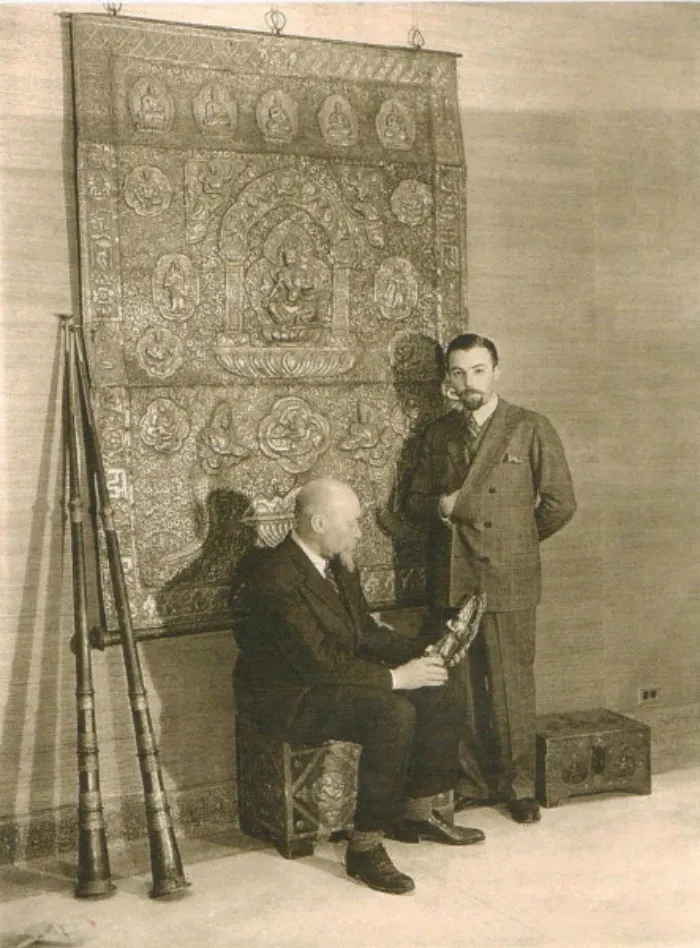 Николай Рерих с сыном Юрием у принадлежавших им буддийских святынь в Нью-Йорке