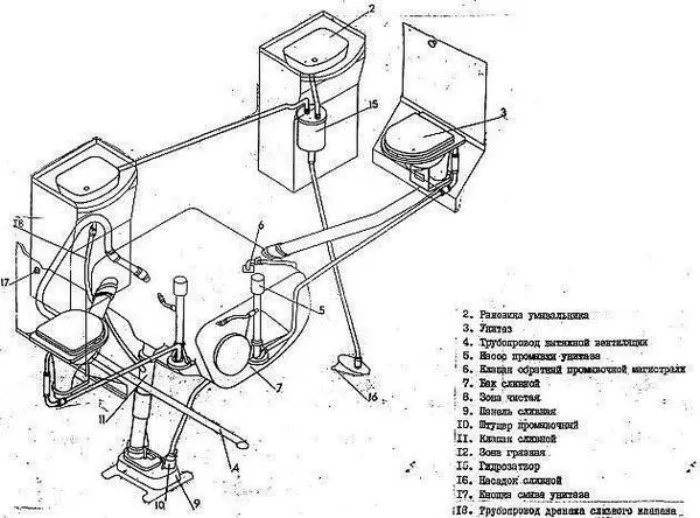 На старых моделях Ту-154Б и Ту-154М располагаются 3 бака (задние туалеты, кухня-буфет — середина салона и передний вестибюль). Баки расположены под потолком и вода туда поступает самотеком. Система достаточно сложна в обслуживании и доставляет массу неудобств. Например, в этих моделях баки приходится заправлять отдельно, перебежками от бака к баку. В более современных летательных аппаратах направленная в бак жидкость распределяется по раковинам кипятильникам и прочим пунктам под давлением. Оно создается в водяном баке с помощью воздушных компрессоров. Все просто. А теперь вернемся к насущной теме — туалет. Понятно, что с отбросами поступать так же не правильно. Поэтому в А-320 отходы поступают в специальный бак на 170 литров, а вот в Ту-154М картинка немного другая.