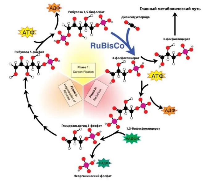 Цикл Кальвина из темновой фазы фотосинтеза во время которого идёт фиксация углерода из воздуха