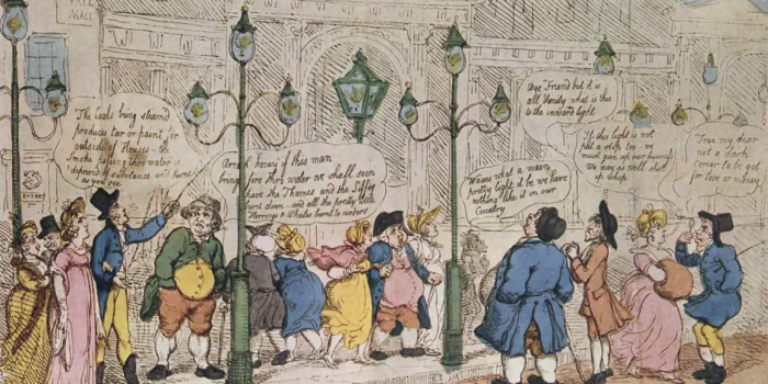 Газовые фонари в Пэлл‑Мэлл, карикатура Джорджа Роулендсона, 1809 год
