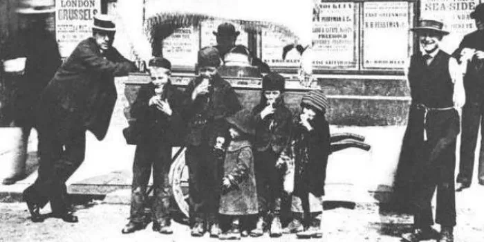 Мороженщик продаёт детям эскимо из мела, фотография XIX века