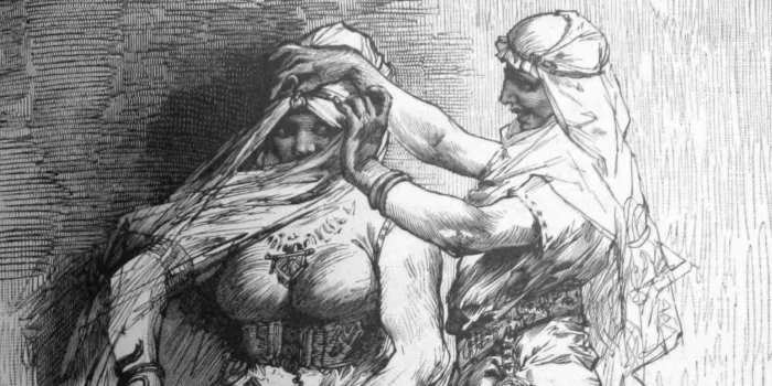 Локи в наряде служанки переодевает Тора. Иллюстрация Карла Ларссона и Гуннара Форселла, 1893 год