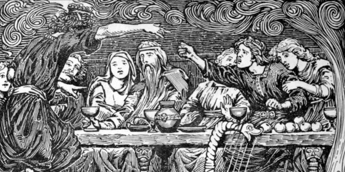 Локи оскорбляет Браги. Иллюстрация У. Г. Коллингвуда, 1908 год