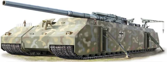 Сверх-тяжёлый танк «Landkreuzer P. 1000 Ratte» («Крыса»). Вес — 1000 тонн. Размеры: 35 х 14 м, высота: 11 м. Экипаж — целый взвод из двадцати человек. В движение должен был приводиться двумя 24-цилиндровыми двигателями от подводной лодки по 8400 лошадиных сил каждый. Скорость на ровной местности — до 40 км/час. Вооружение: два главных орудия — корабельные пушки калибра 280 мм, сзади — башня со 126-мм орудием, 6 зениток для защиты от воздушных атак, несколько противопехотных пулемётов. Внутри танка предусмотрен гараж для разведывательных мотоциклов.