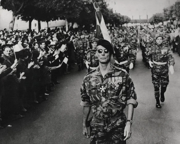 Кадр из художественного фильма "Битва за Алжир" 1966 года демонстрирует лик французской военщины. Лента была создана итальянским режиссером Джилло Понтекорво, левым режиссером, снимавшим кино на политические темы. Фильм был снят предельно реалистично и во многом напоминает документальный. Он даже получил "Золотого льва" на 21-м Венецианском кинофестивале. По понятным причинам долгое время был запрещен во Франции.