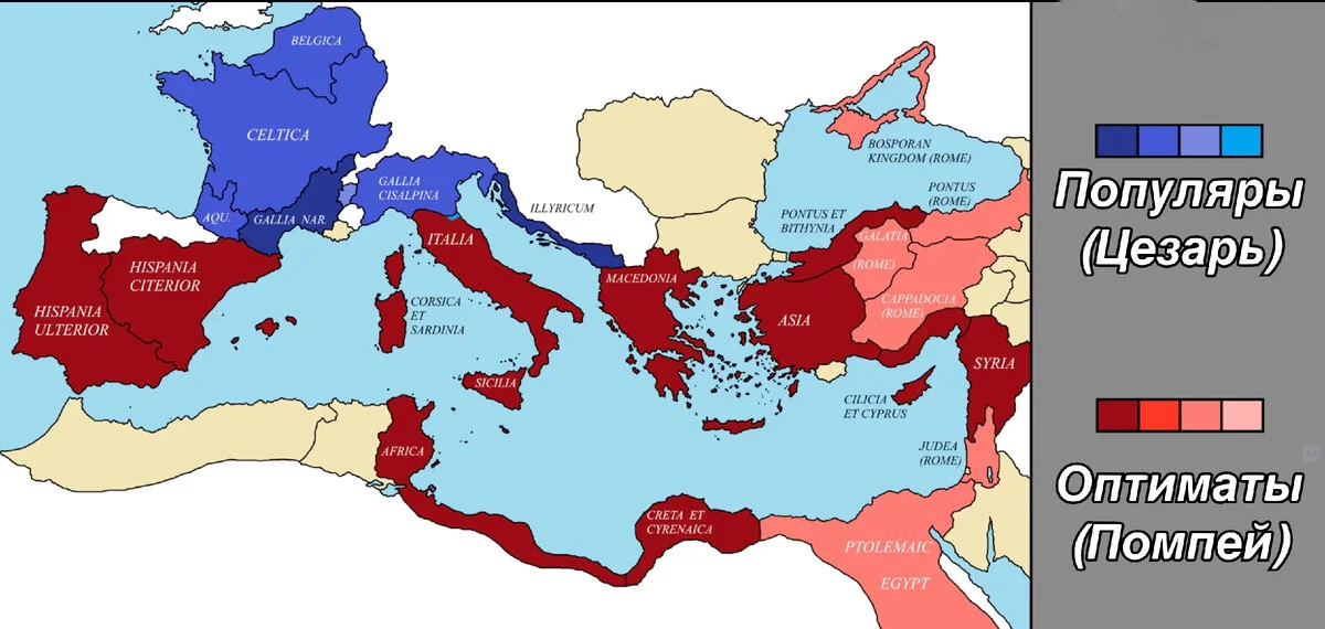 Конфликт, разгоревшийся между проконсулами Юлием Цезарем и Гнеем Помпеем. С точки зрения народа олицетворял противостояние двух политических партий: популяров, отстаивавших интересы плебса, и оптиматов, сторонников сенатской аристократии.