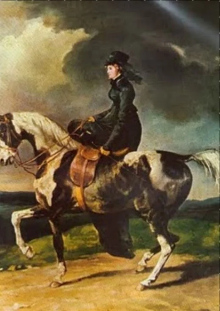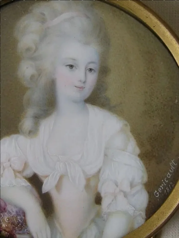 Жерико пользовался успехом у женщин. На свою беду он влюбился в жену своего дяди (брата матери). Считается, что на этом портрете, который художник написал в 1812 году, изображена Александрин Каруэль, баронесса де Сен-Мартен. Ей тогда было 27 лет, ему 20. Отец Алли, как ее звали близкие, погиб во время Наполеоновских войн. Дед решил устроить судьбу 16-летней внучки, выдав ее замуж за мужчину на 27 лет старше. Жан-Батист Каруэль был банкиром, сколотившим состояние во время войн, и, как считается, заинтересовался девушкой из-за ее титула (в то время во Франции мужья могли получать титулы жён). У пары родилось двое сыновей.