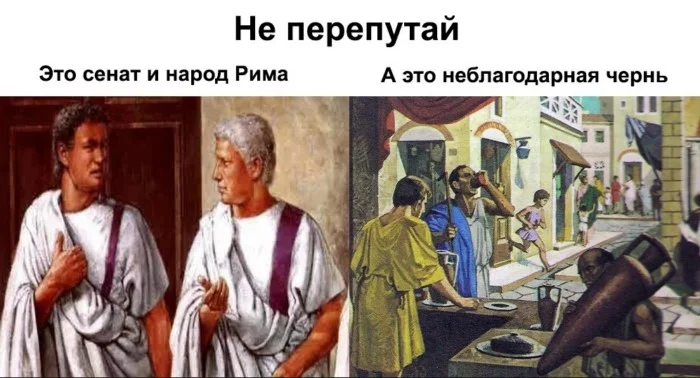 Да, твоё эго размером превосходит размеры твоей же империи, но это поправимо – дранг нах везде это по-римски. Вот только есть одна проблема – когда эти все прекрасные мысли вертятся в бошках нобилитета, то если они говорят "народ", то понимают вообщет себя любимых, а не какой-то плебс. И то же самое и в случае с пафосным Римским государством или Республикой – это они государство, это они Республика, сенаторы одетые в тоги с красной полосой, которая демонстрирует всем окружающим, что это не просто человек. А если ты плебей – то ты видишь величие Рима, видишь величие сенаторов, а вот своего величия не видишь, от слова совсем.