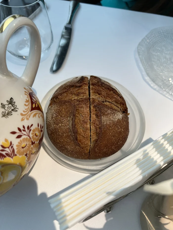 Нас провели к столику у окна. Посетителей, кстати, было немного. Дали меню, от винной карты отказались - не пьём. Первая сложность - определиться с заказом. Привычных котлеток с пюрешкой, естественно, не оказалось. Блюда, как правило, с необычными ингредиентами или сочетанием. Жена подсказала взять что-нибудь из морепродуктов. Выбирал между палтусом и треской, официант однозначно отдавала предпочтение треске, объяснив свой выбор. В общем, сделали мы заказ и стали ждать, любуясь интерьером и видом из окон. Попутно официанты принесли приборы и тарелки.