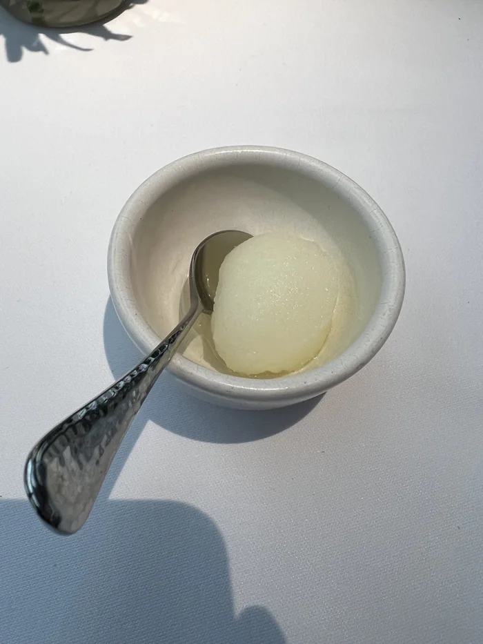 Камчатского краба я не ел никогда, решил попробовать. Сам краб напоминает нечто похожее на крабов, которых я ел заграницей и (внезапно) лососем. Морепродукт со сладковатым оттенком, мясистой структурой. Щучья икра мне нравилась всегда и в тот раз она не подвела. Что за соус был в тарелке, я не знаю, но все ингредиенты сочетались отлично. Ещё одно вкусное блюдо, к которому не придраться. Когда мы закончили с закусками, нам подали небольшие розетки (или как правильно?) с лимонным сорбетом, пояснив, что перед основным блюдом принято съесть лимончику, чтобы обновить вкусовые рецепторы.