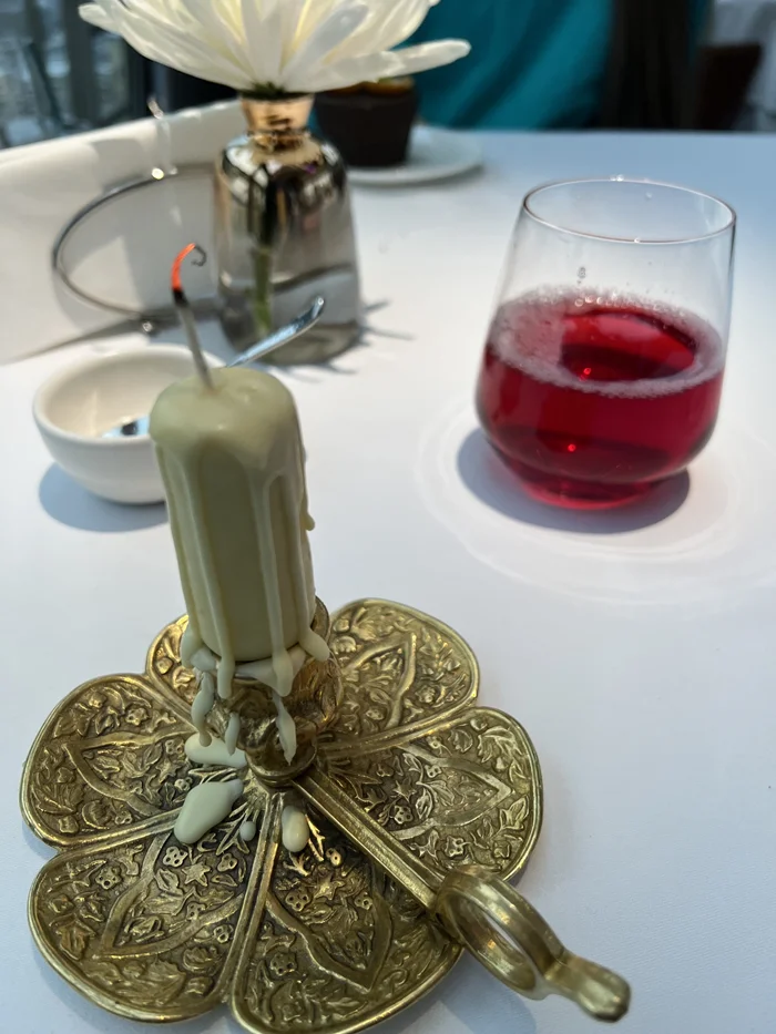 Маленькие, но вкусные) Никогда у меня не было желания пробовать козий сыр, но в этом блюде я вновь не почувствовал чего-либо негативного. Мне принесли и зажгли свечу из пломбира, политого белым шоколадом. Намекнули, что следует загадать желание и съесть её до того, как она растает. Нужно уточнять, что свеча тоже вкусная?) Но пломбир внутри шоколадной оболочки действительно уже таял.