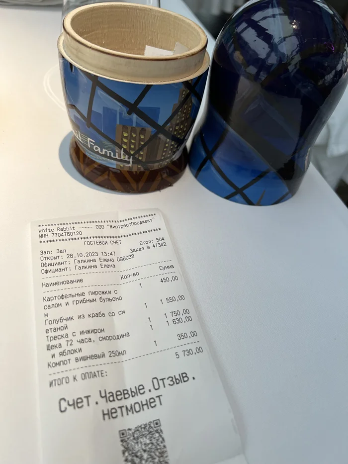 Ну и то, что обычно, всем наиболее интересно. Наш счёт вышел на 5730 рублей. На мой взгляд, не слишком большая сумма, чтобы посетить ресторан, отмеченный авторитетным изданием как один из лучших в стране. Заведение не на каждый день, но зайти по какому-то значимому поводу вполне возможно. Также, мне кажется, это прекрасная идея для подарка человеку, который любит попробовать что-то новое (но который ни разу в таком месте не был).