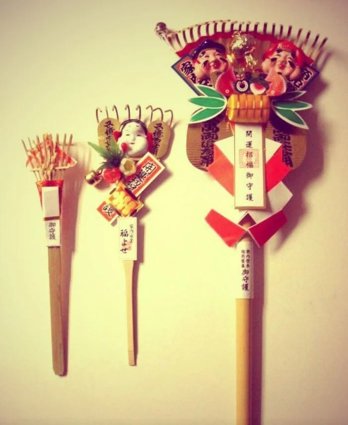 Самым лучшим подарком в Стране Восходящего Солнца считаются бамбуковые грабли. Именно они, согласно традиции, загребают счастье. Грабли конечно же украшены разными надписями или рисунками. А вот букеты не дарят - это самое настоящее оскорбление для японца, так как букеты на Новый год дарят только члены императорской семьи.