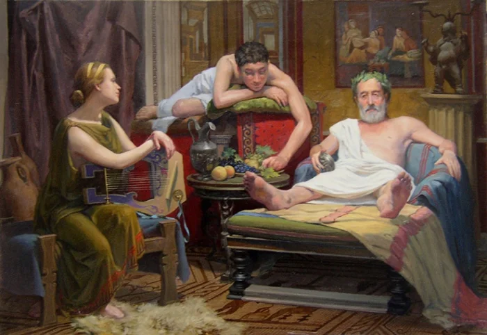 Попросил нейросеть нарисовать римлян за трапезой. Странное восприятие у искусственного интеллекта). Особенно порадовали руины на фоне. Руинами то они стали гораздо позже, а при самих римлянах - все прекрасно!)