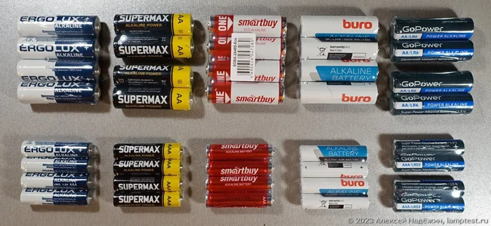 Чтобы провести этот эксперимент, мне пришлось купить 400 батареек: я купил и протестировал по пять видов щелочных (alkaline) батареек AA и AAA в такой упаковке, при этом цена за штуку составила от 11 до 16 рублей. Оказалось, что батарейки с близкой ценой очень сильно отличаются.