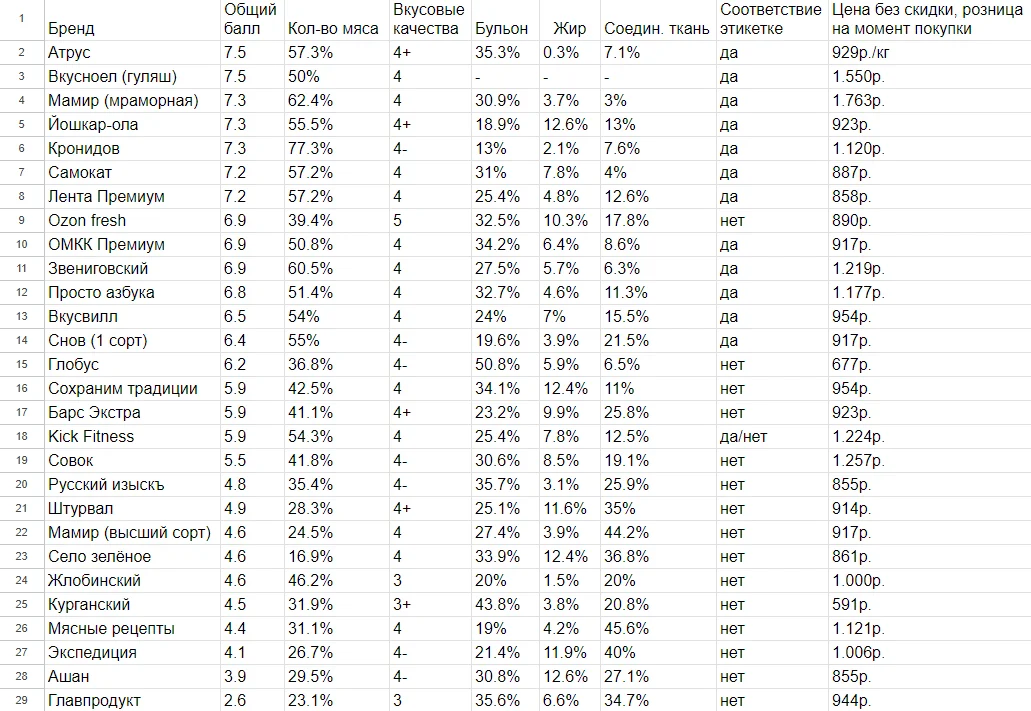 Однако я решил не включать этот параметр в расчёт баллов, поскольку такой ранжир может поставить премиум продукт в один ряд с тушёнкой среднего качества, что при задаче выявить самый качественный продукт - бессмысленно.