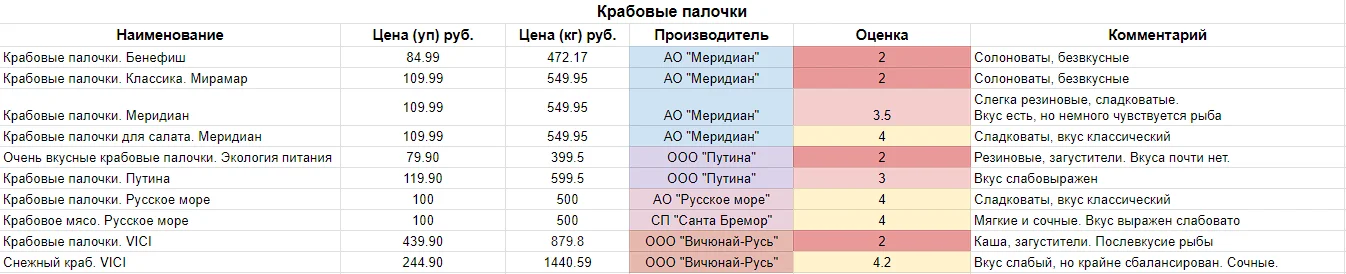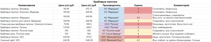 Перед подведением итогов скажу, что несмотря на то, что некоторые крабовые палочки были без вкуса, резиновые, загущенные или солоноватые, но при этом все они примерно были похожи. Испробовав каждого представителя по несколько раз, возникло стойкое ощущение неприязни к крабовым палочкам, потому что общий их вкус всё же разочаровал. Ни один из них не был ярко выраженным и в целом чувствовалась какая-то не натуральность, словно тебя упорно пытаются "обмануть". Согласен, что в целом это так есть. Крабовые палочки из рыбы нам выдают под видом крабовых палочек, но тем не менее, ожидали от них большего. Какого-то удовольствия от их поедания не получили, а раньше все они казались были лучше по вкусу. Дошло до того, что промелькнула мысль, чтобы в крабовых салатах заменить крабовые палочки на что-то другое. Но на что? Креветки? Хм, как вариант.