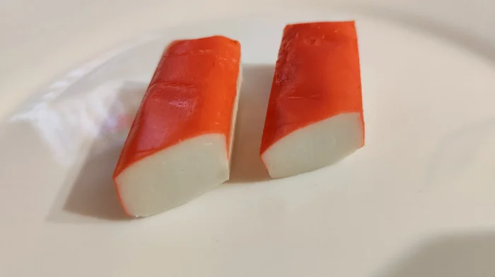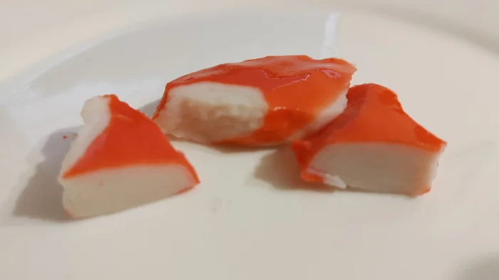 Вкусовые качества: Крабовые палочки солоноваты, вкуса нет, будто жуешь бумагу. Текстура чувствуется, но какой в ней смысл, если сами крабовые палочки безвкусны?