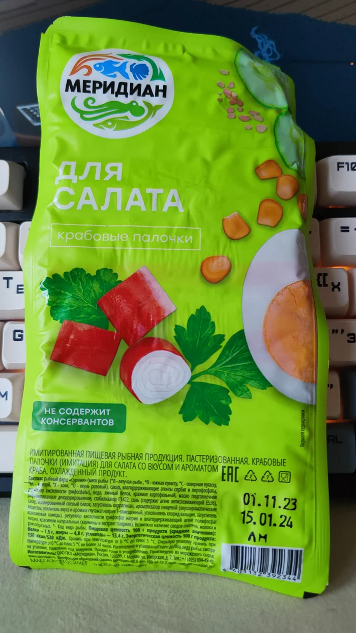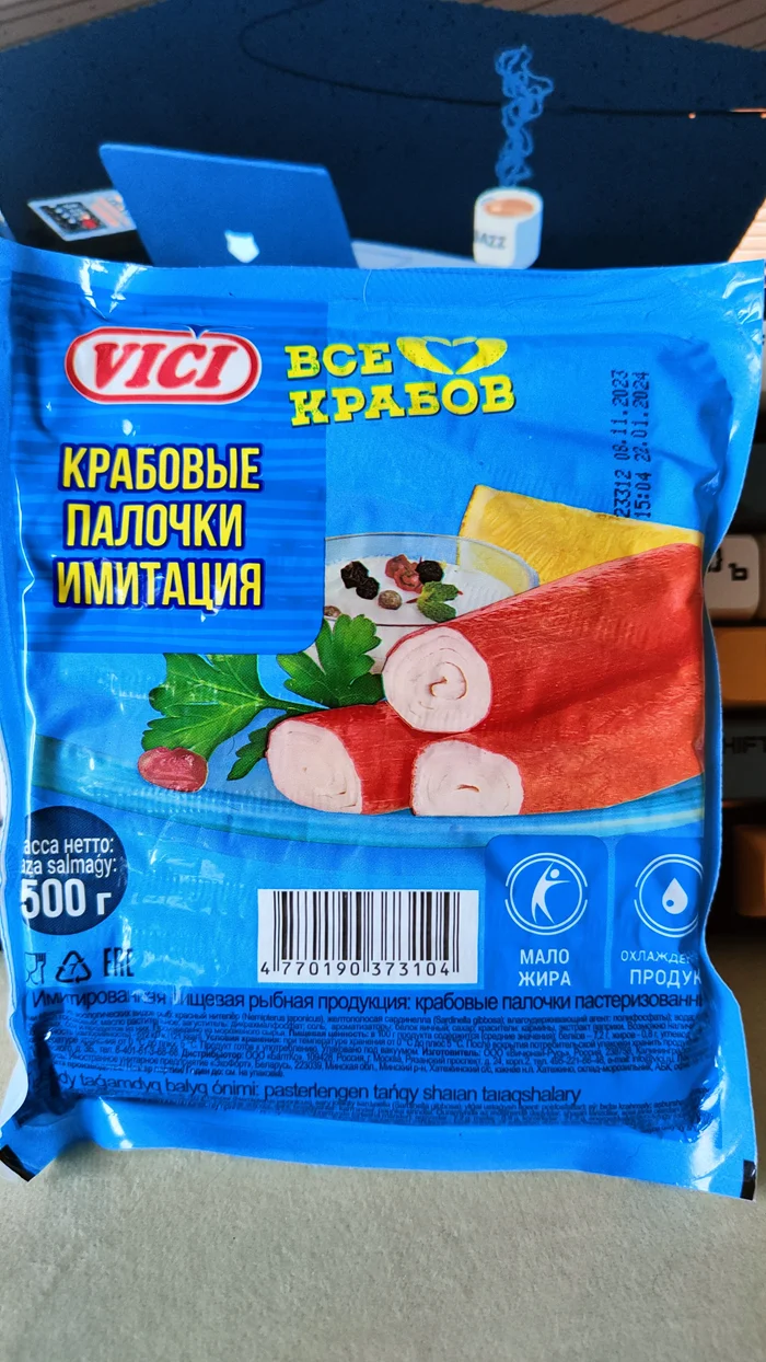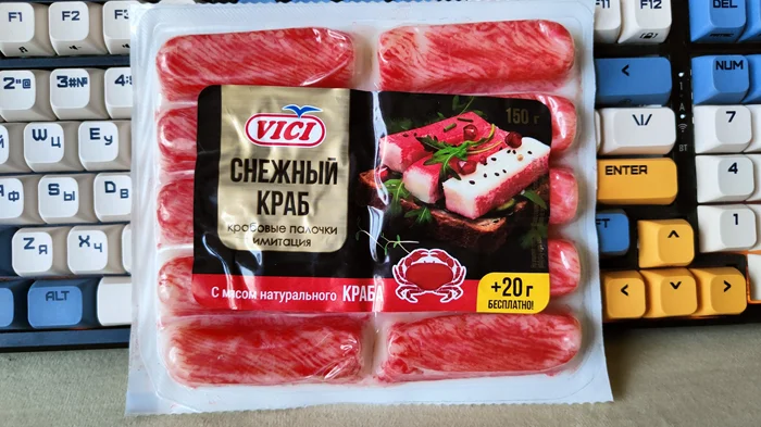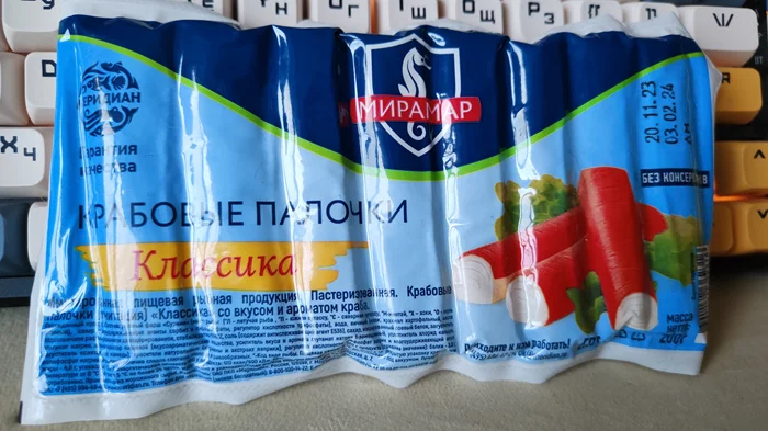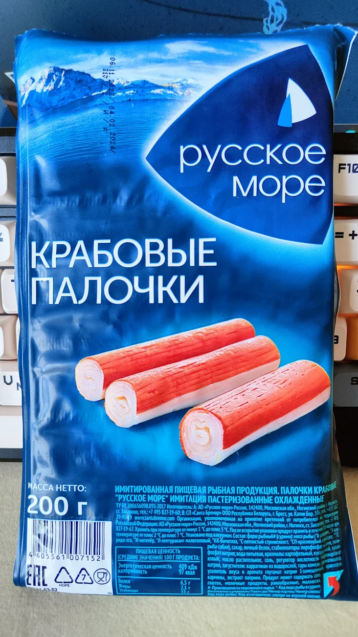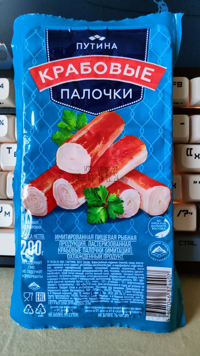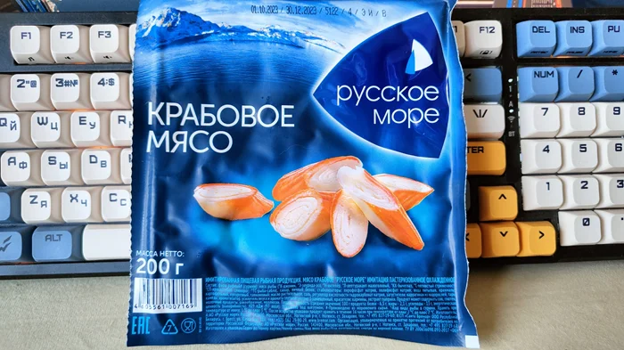 Я возможно придираюсь, но на первый взгляд, если не смотреть на цену а только лишь на упаковку, то может показаться, что здесь должно было присутствовать крабовое мясо. На упаковке написано "Крабовое мясо", но его здесь нет. Как считаете, правильно ли так писать? Или я здесь такой один был наивным? Жена объяснила, что крабовое мясо будет присутствовать только там, где прямо об этом говорится, а то, что его здесь нет, это нормально. Различие лишь в форме продукта. Там палочки, здесь якобы рубленное мясо, от того и разное название.