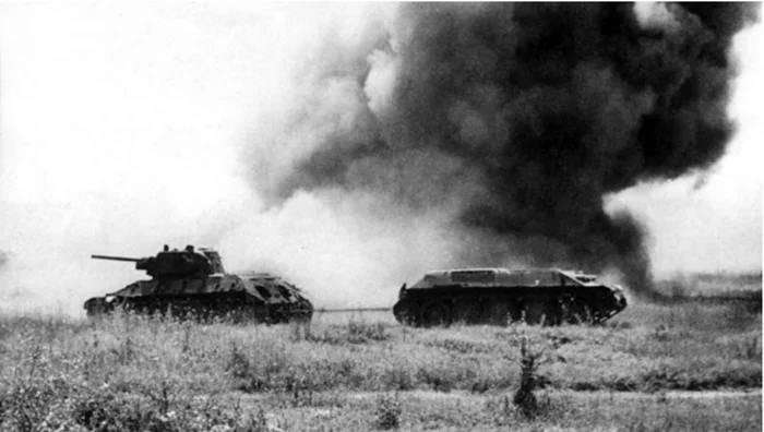 Буксировка подбитого танка Т-34 с поля боя тягачом на базе Т-34 (без башни) под обстрелом противника. Танкисты их называли "жучками"
