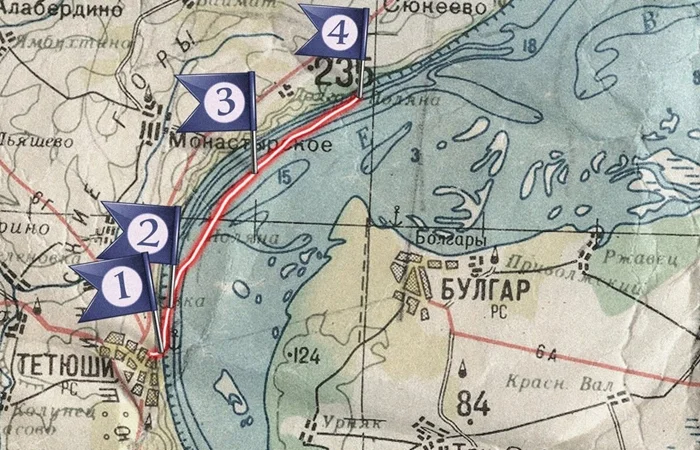 1 — здесь группа школьников спустилась к реке; 2 — здесь обнаружили троих ребят, посланных за помощью, 3 — здесь Саша Горбаченко встретил рыбаков; 4 — отсюда поднимали наверх в Долгую Поляну остальных пострадавших